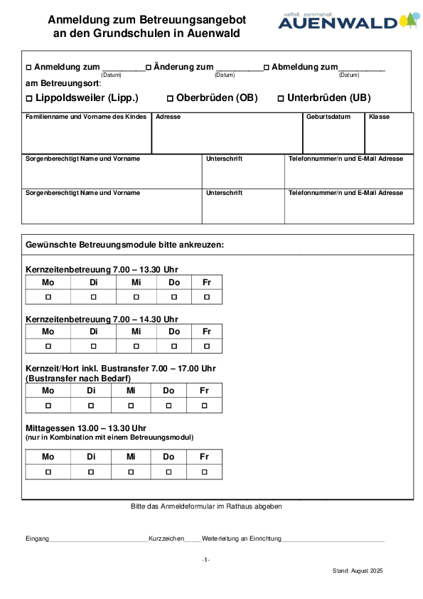 bitte beachten Sie, dass Anmeldungen, Änderungen oder Abmeldungen für die Betreuung in der Kernzeit und im Hort 4 Wochen, für die Ferien immer 8 Wochen im Voraus abgegeben werden müssen. Die Ferienbetreuung bzw. die unterschiedlichen Betreuungsformen finden nur statt, wenn jeweils mindestens 5 Anmeldungen fristgerecht eingehen. Bitte geben Sie die An-, Ab- und Ummeldungen im Rathaus bei Frau Weber im Zimmer 37 ab oder senden Sie diese per Email an kinderbetreuung(@)auenwald.de. Falls Sie noch Fragen haben, stehen Ihnen die Teams vor Ort oder die Servicestelle Kindergarten im Rathaus gerne zur Verfügung.